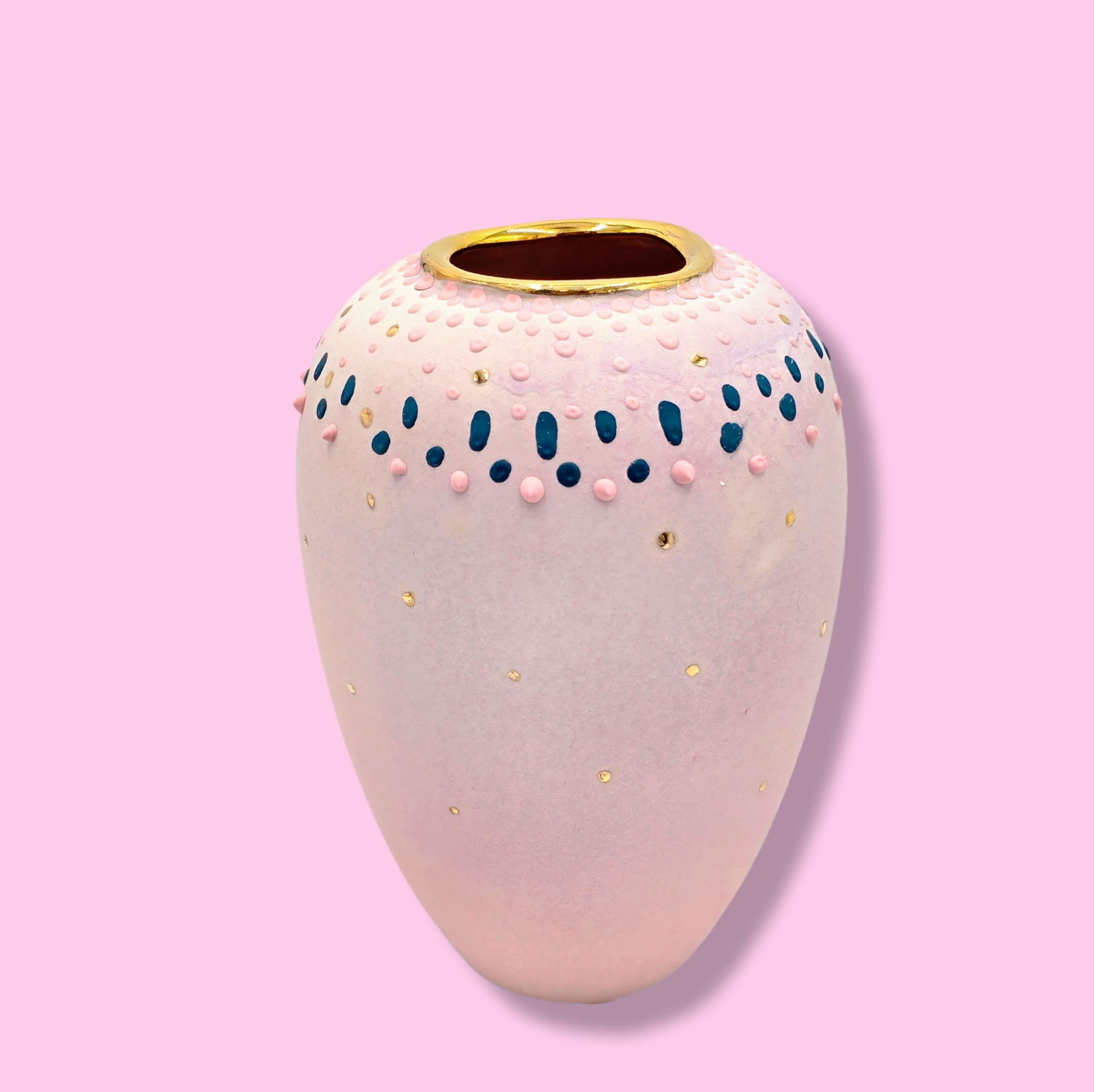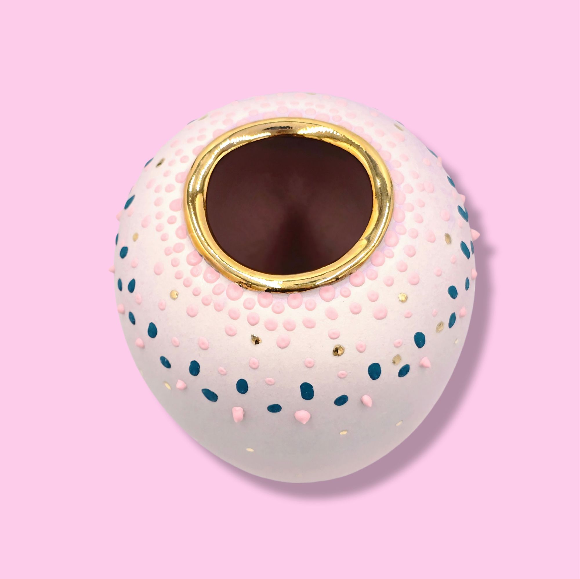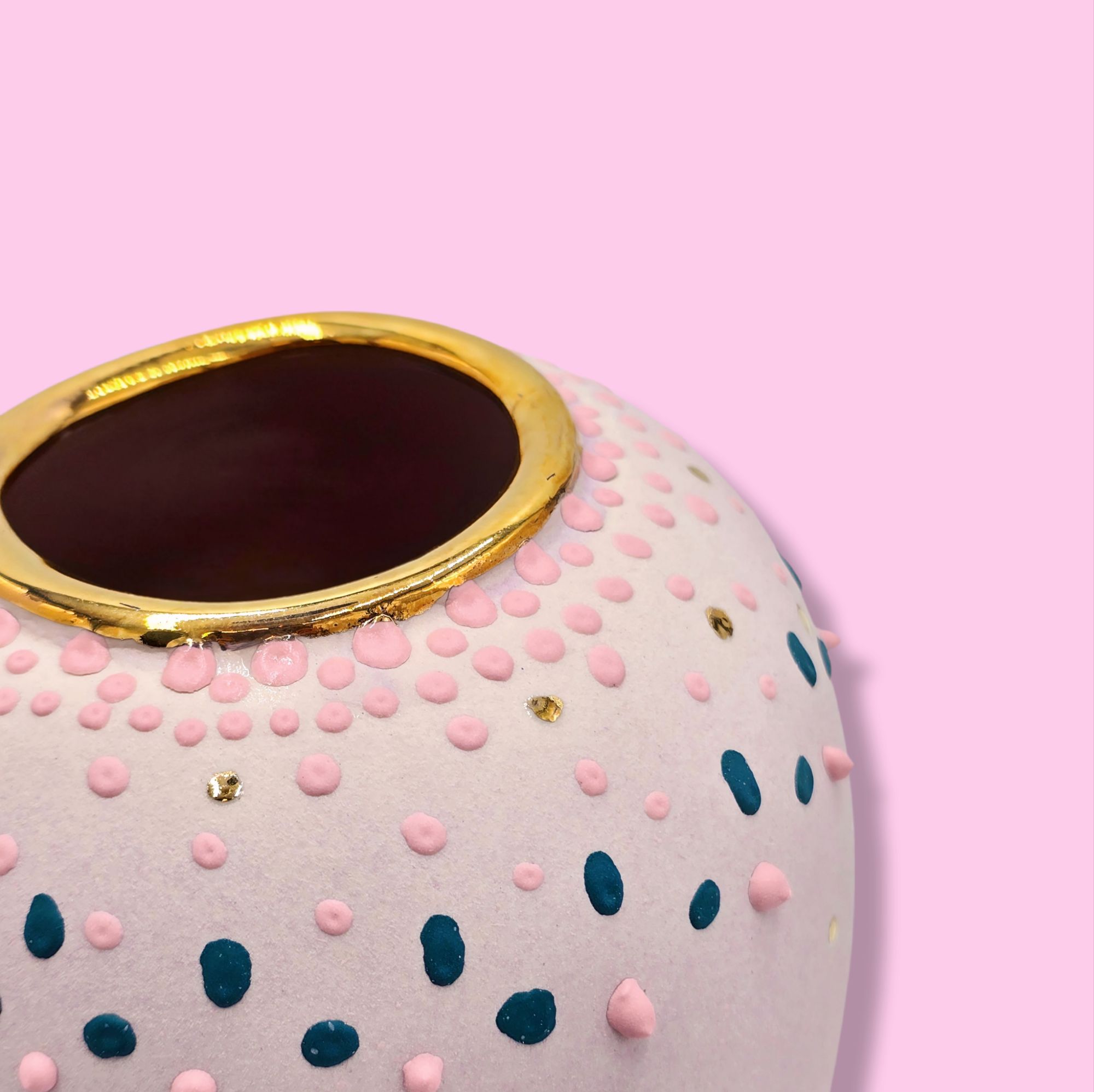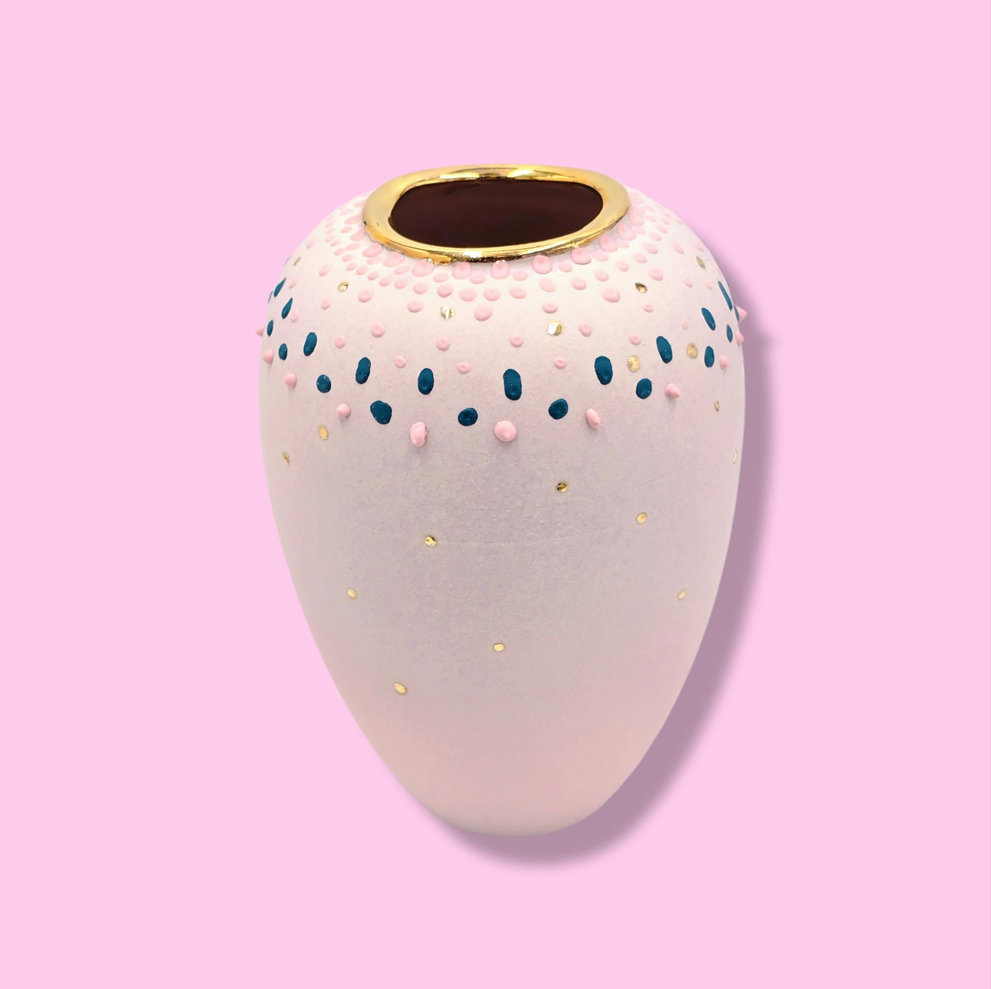 Handcrafted from porcelain, this sculptural vase combines a Pink ombre color with scattered golden freckles, matte midnight green and pink dots. Finished with a 22k gold rim.